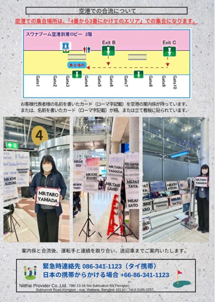 指定時間を10分経過しても案内係が見当たらなかったり名前が確認できない場合は、お手数ですが、緊急連絡先電話番号(086-341-1123 タイの携帯電話)までご連絡下さい。