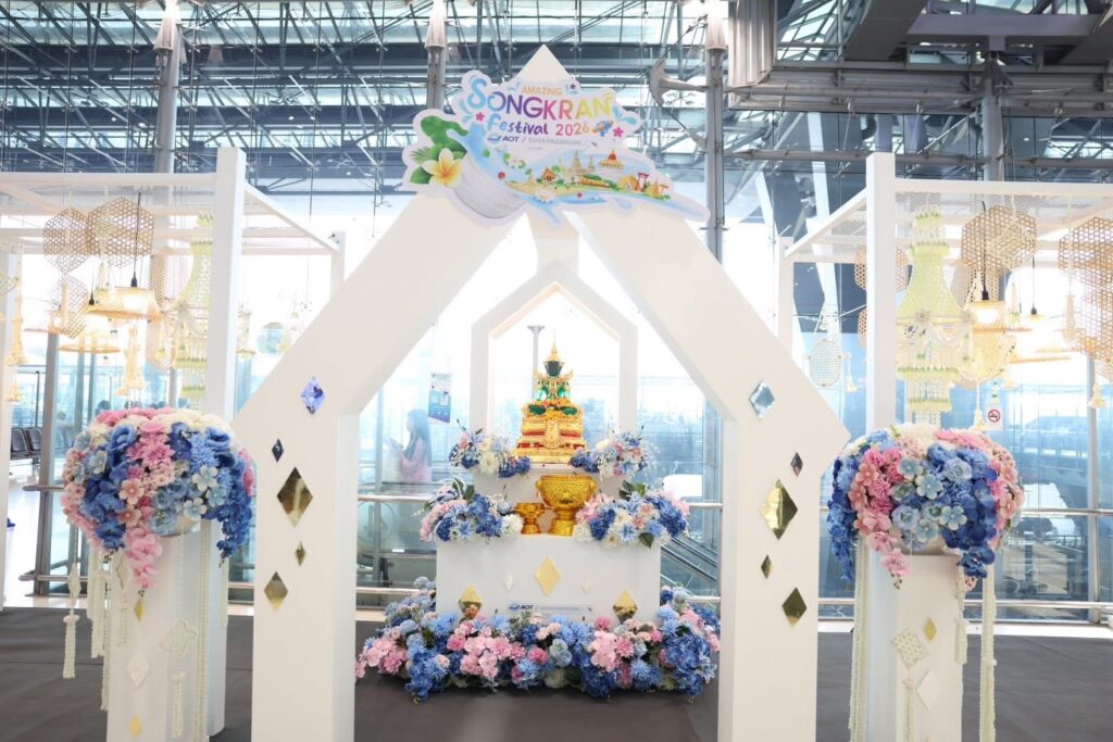 空港内の各場所では、写真スポットやソンクランの雰囲気が演出され、到着した瞬間からタイのソンクラン文化を感じられます。